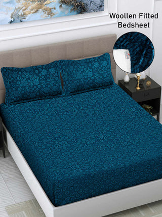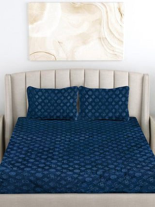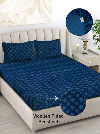 FABINALIV Navy Blue Geometric 300 TC Woollen Embossed King Size Fitted Double Bedsheet with 2 Pillow Covers