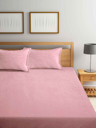 FABINALIV Baby Pink Solid 300 TC Woollen King Size Fitted Double Bedsheet with 2 Pillow Covers (250X225 cm)