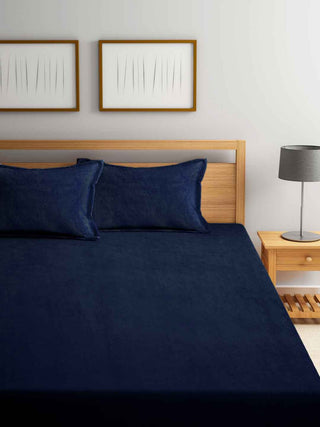 FABINALIV Navy Blue Solid 300 TC Woollen King Size Fitted Double Bedsheet with 2 Pillow Covers (250X225 cm)