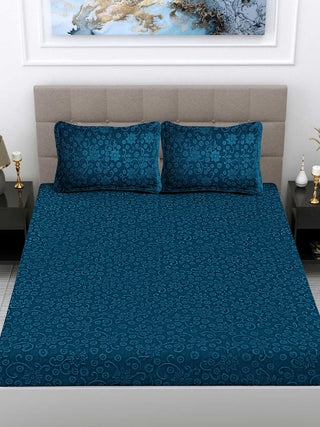 FABINALIV Rama Blue Floral 300 TC Woollen Embossed King Size Fitted Double Bedsheet with 2 Pillow Covers