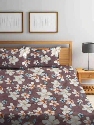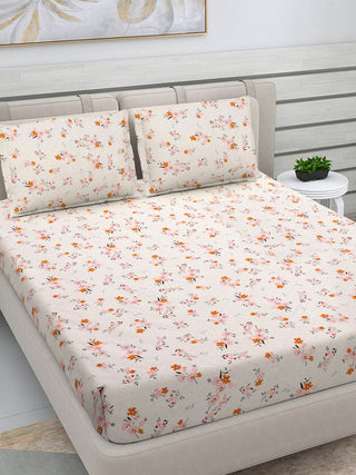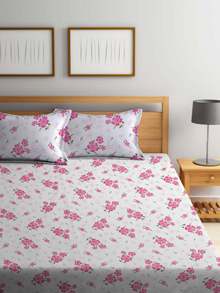 White Floral 300 TC Cotton Blend King Size Double Bedsheet with 2 Pillow Covers (250X225 cm)