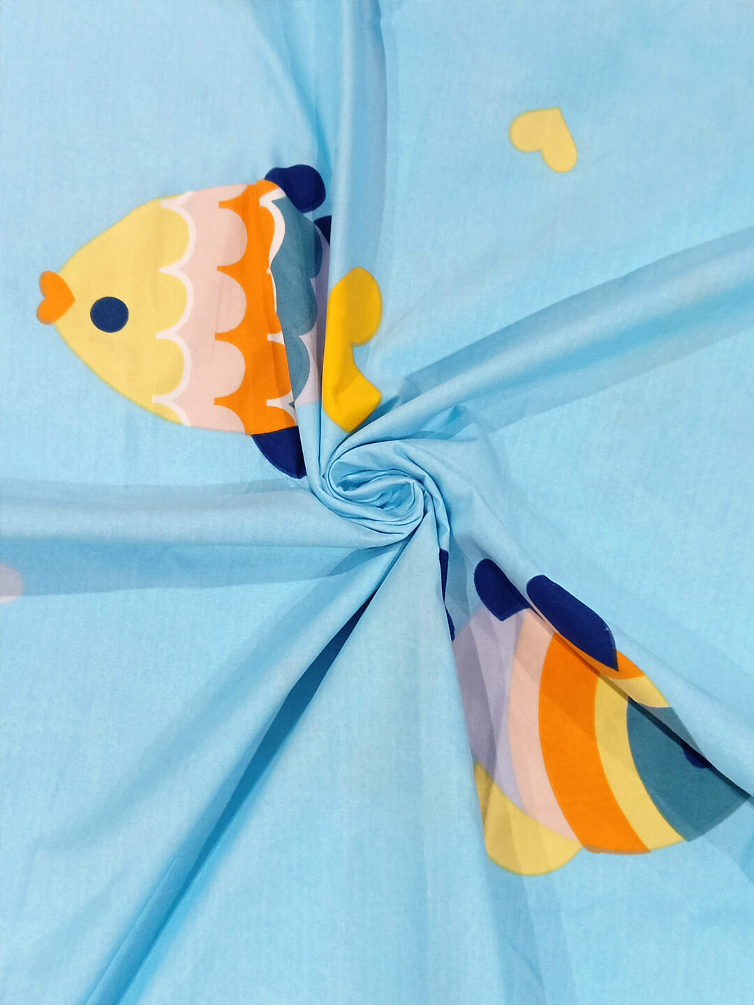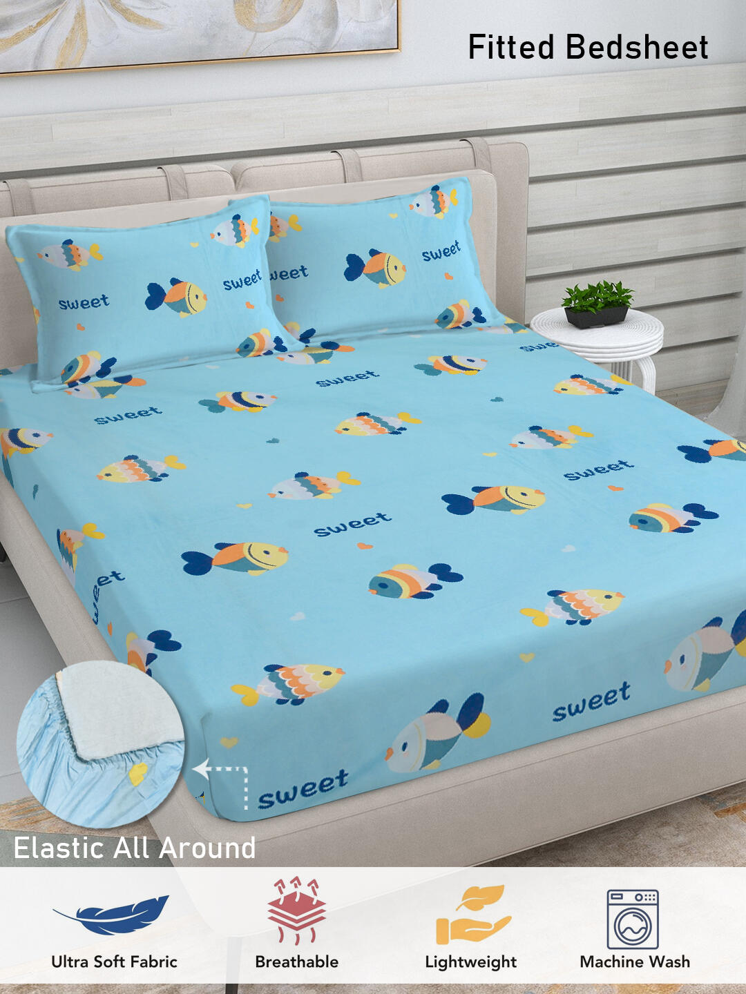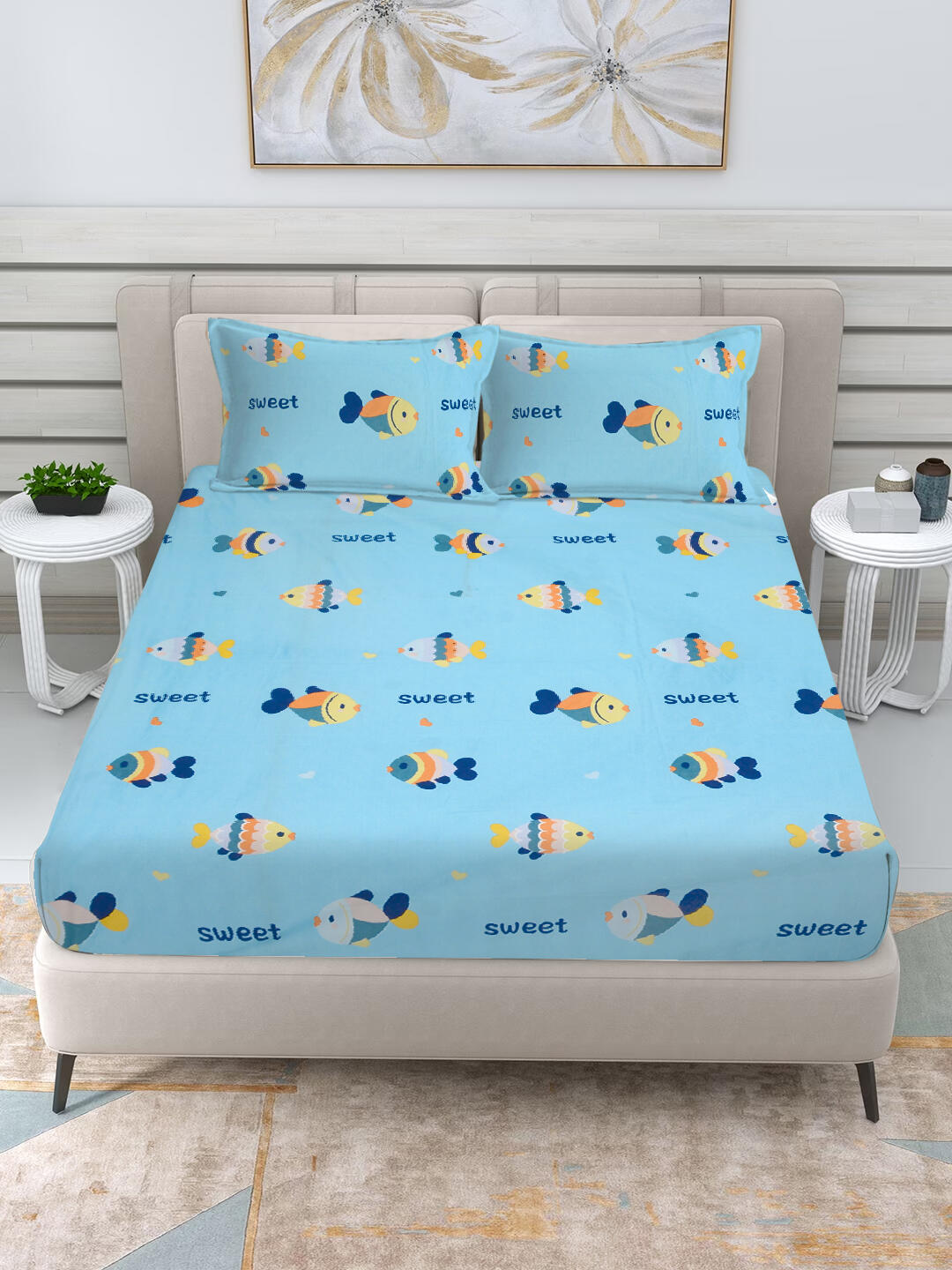 FABINALIV Blue Cartoon Print 300 TC Cotton Blend King Size Fitted Doub