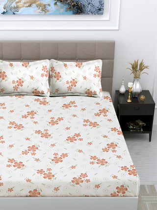 FABINALIV White Floral 300 TC Cotton Blend King Size Fitted Double Bedsheet with 2 Pillow Covers (250X225 cm)