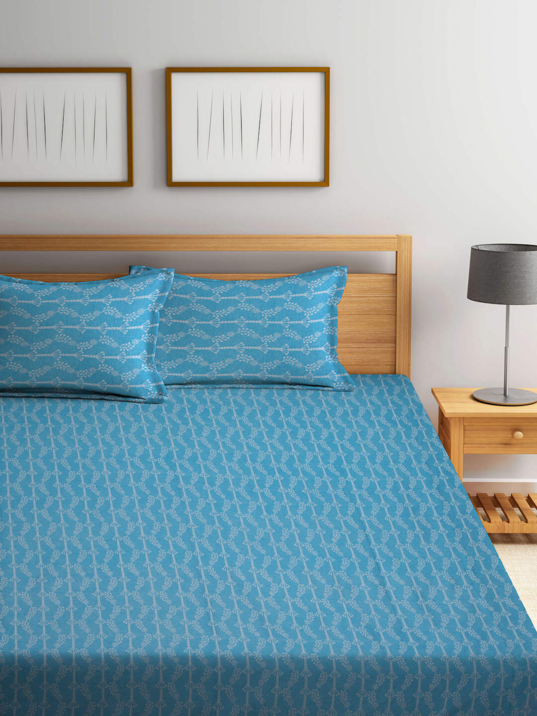 FABINALIV Blue Floral 100% Cotton Handwoven King Size Double Bedsheet with 2 Pillow Covers (250X225 cm)
