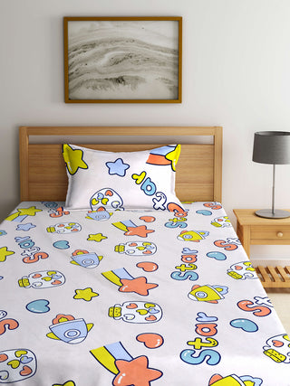 FABINALIV White Cartoon Print 300 TC Cotton Blend Single Bedsheet with Pillow Cover (225X150 cm)