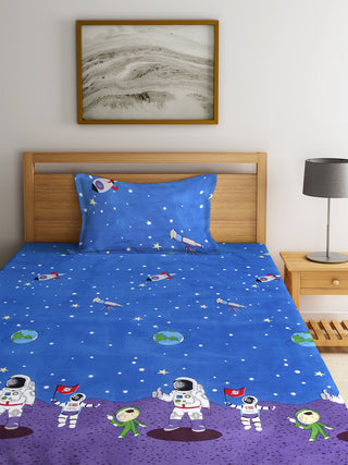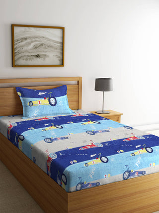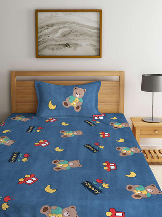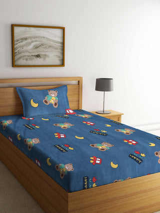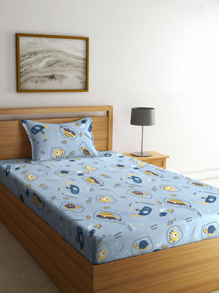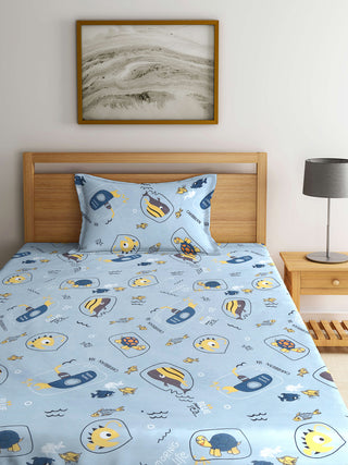 FABINALIV Blue Cartoon Print 300 TC Cotton Blend Single Bedsheet with Pillow Cover (225X150 cm)