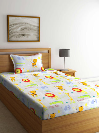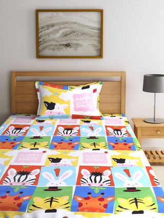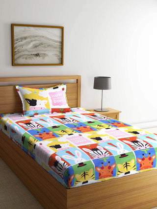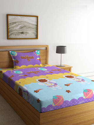 FABINALIV Multicolor Cartoon Print 300 TC Cotton Blend Single Bedsheet with Pillow Cover (225X150 cm)