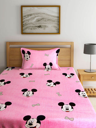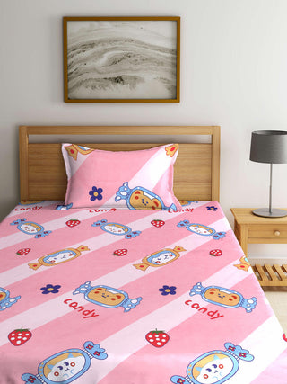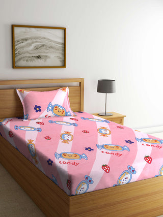 FABINALIV Pink Cartoon Print 300 TC Cotton Blend Single Bedsheet with Pillow Cover (225X150 cm)