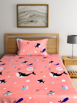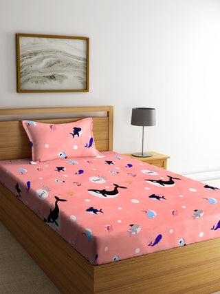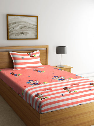 FABINALIV Peach Cartoon Print 300 TC Cotton Blend Single Bedsheet with Pillow Cover (225X150 cm)