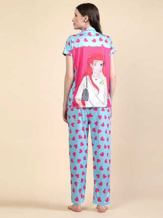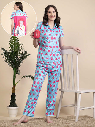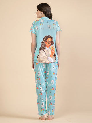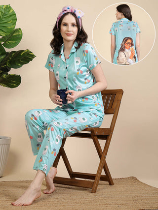 FABINALIV Turquoise Abstract Graphic Printed Women Night Suit