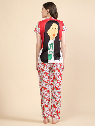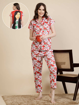 FABINALIV Red Floral Graphic Printed Women Night Suit