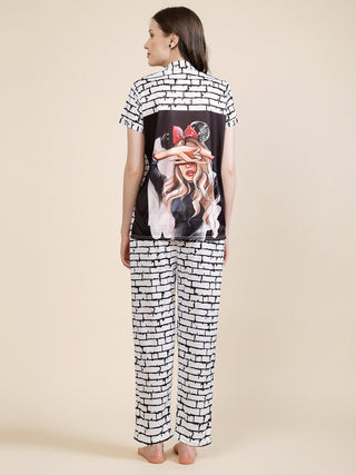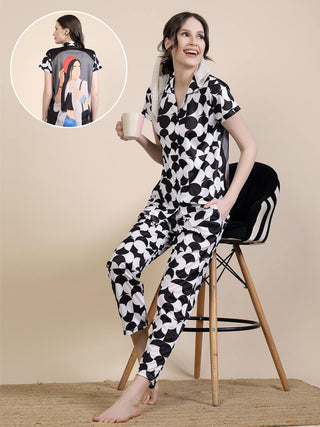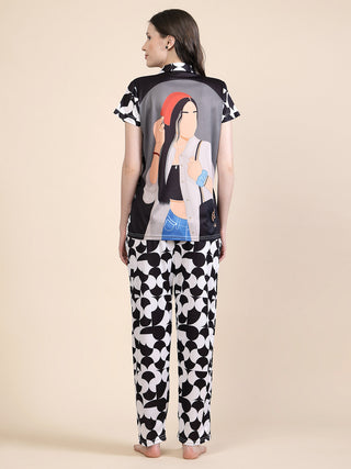 FABINALIV Black Abstract Graphic Printed Women Night Suit