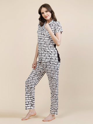 FABINALIV White Geometric Graphic Printed Women Night Suit