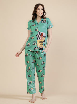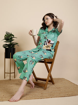 FABINALIV Green Abstract Graphic Printed Women Night Suit