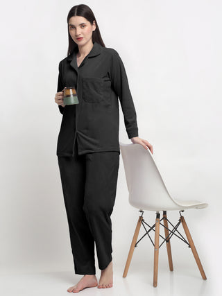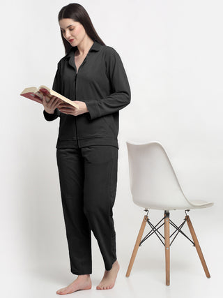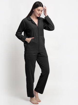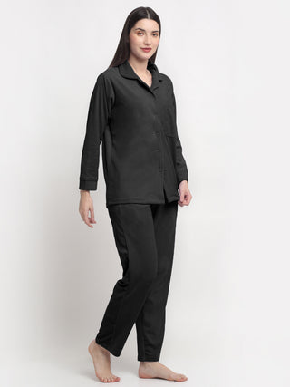 FABINALIV Women Black Solid Velvet Winter Night Suit