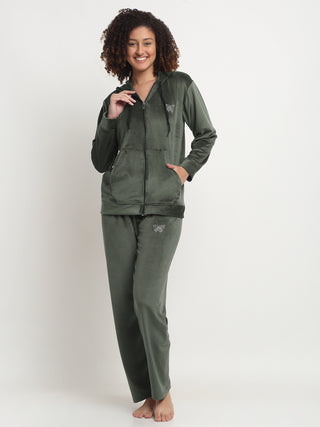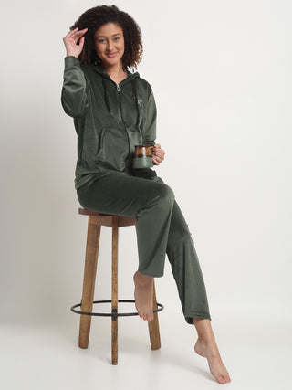 FABINALIV Women Green Solid Hooded Velvet Winter Night Suit