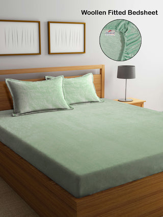 FABINALIV Light Green Solid 300 TC Woollen King Size Fitted Double Bedsheet with 2 Pillow Covers (250X225 cm)