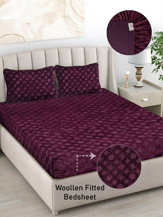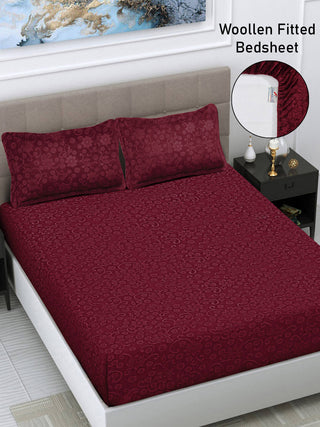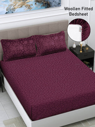 FABINALIV Wine Geometric 300 TC Woollen Embossed King Size Fitted Double Bedsheet with 2 Pillow Covers