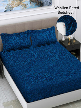 FABINALIV Rama Blue Solid 300 TC Woollen King Size Fitted Double Bedsheet with 2 Pillow Covers (250X225 cm)