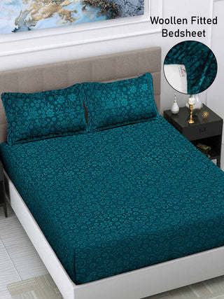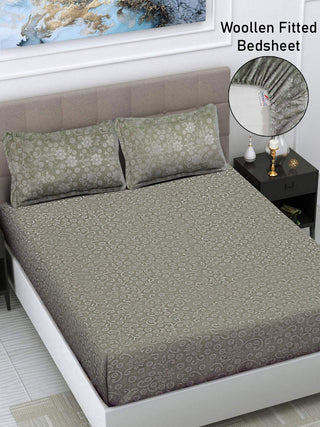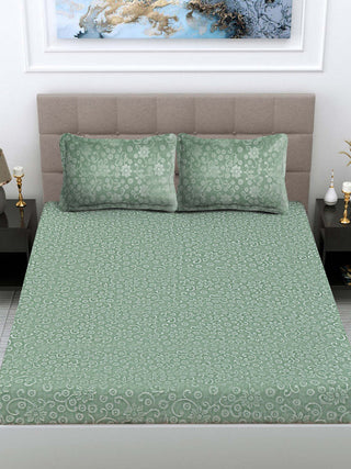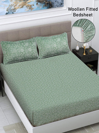 FABINALIV Rama Green Floral 300 TC Woollen Embossed King Size Fitted Double Bedsheet with 2 Pillow Covers
