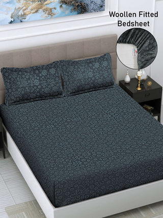 FABINALIV Dark Grey Floral 300 TC Woollen Embossed King Size Fitted Double Bedsheet with 2 Pillow Covers