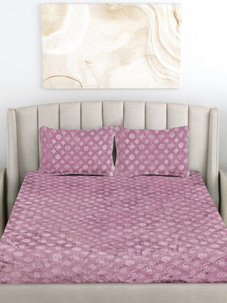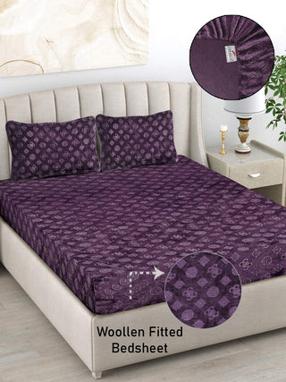 FABINALIV Raisin Purple Geometric 300 TC Woollen Embossed King Size Fitted Double Bedsheet with 2 Pillow Covers