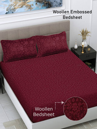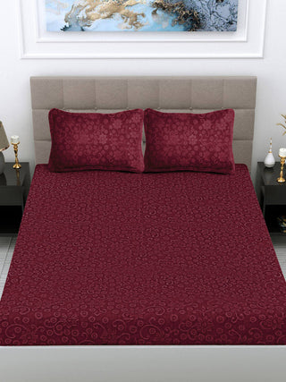 FABINALIV Maroon Floral 300 TC Woollen Embossed King Size Double Bedsheet with 2 Pillow Covers (250X225 cm)