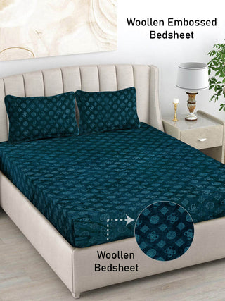 FABINALIV Rama Blue Geometric 300 TC Woollen Embossed King Size Double Bedsheet with 2 Pillow Covers (250X225 cm)