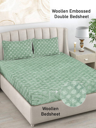 FABINALIV Light Green Geometric 300 TC Woollen Embossed King Size Double Bedsheet with 2 Pillow Covers