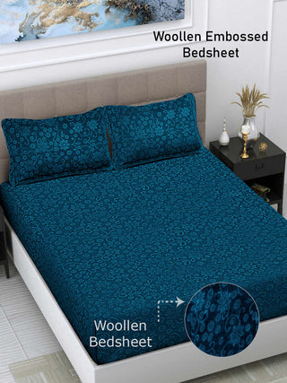 FABINALIV Rama Blue Floral 300 TC Woollen Embossed King Size Double Bedsheet with 2 Pillow Covers (250X225 cm)